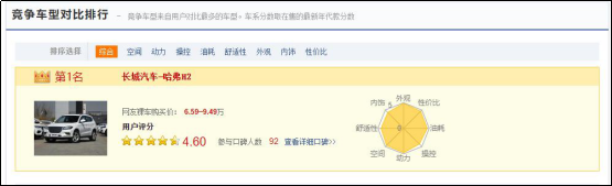例如在汽車之家的口碑體系中,就有一套5分制的評判標準,其中5分為滿分。其中哈弗H2就得到了4.60分(5分制)的綜合高分,位列小型SUV市場口碑第一名。并且在空間、動力、性價比等方面,哈弗H2得分全部4.7+,外觀得分更是達到4.9+,成為口碑中的“得分機器”。